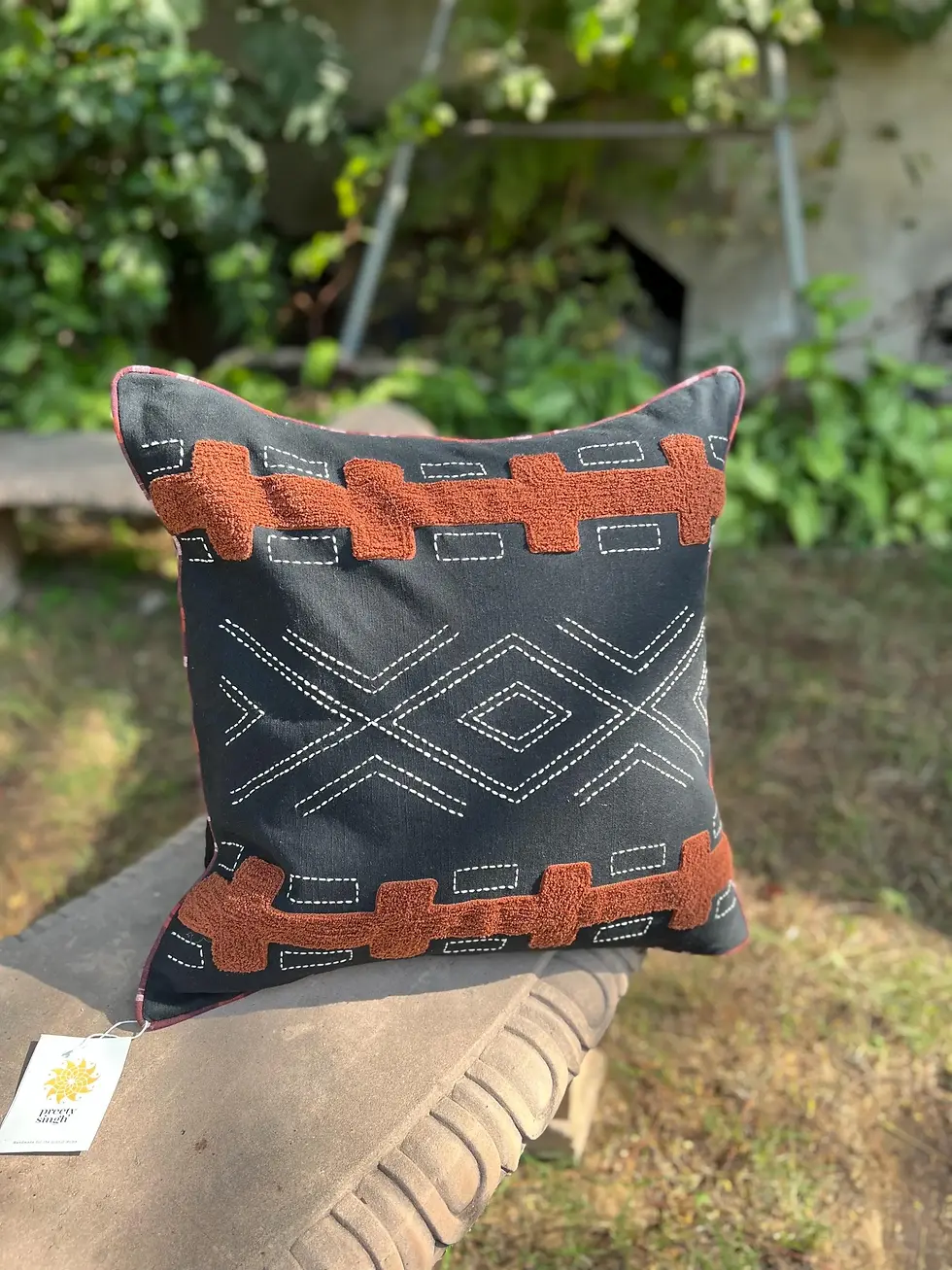 Black Kantha Embroidered Cushion Cover | Handmade Cotton